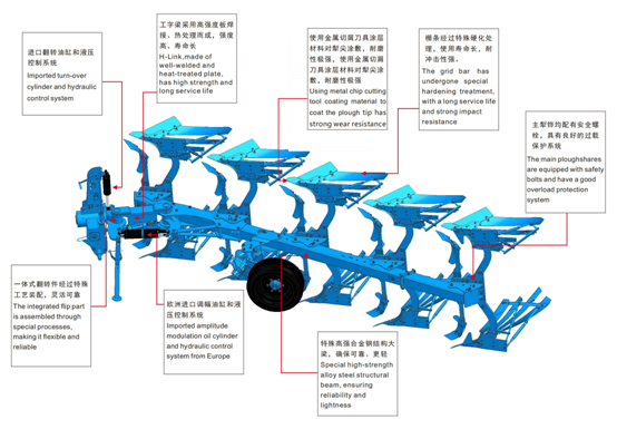? 犁頭、犁梁、翻轉(zhuǎn)軸及工字梁等主體部件均選用高強(qiáng)度特種鋼材通過領(lǐng)先的熱處理及加工工藝制作而成,大幅度減小翻轉(zhuǎn)犁重量的同時(shí),使用性能更加可靠;